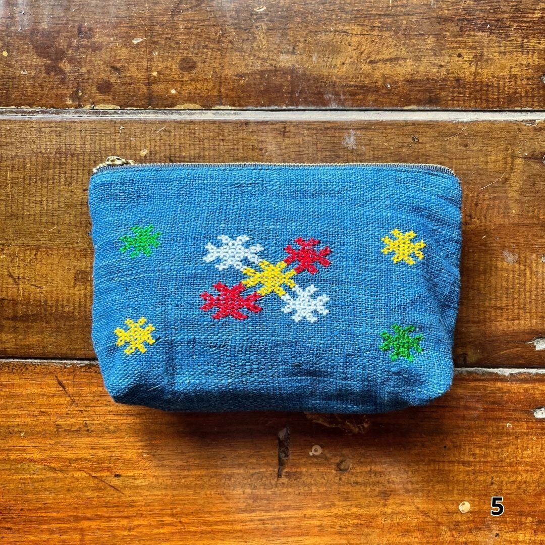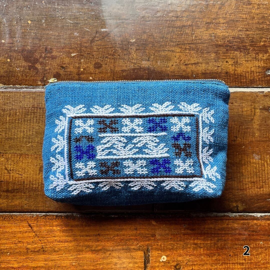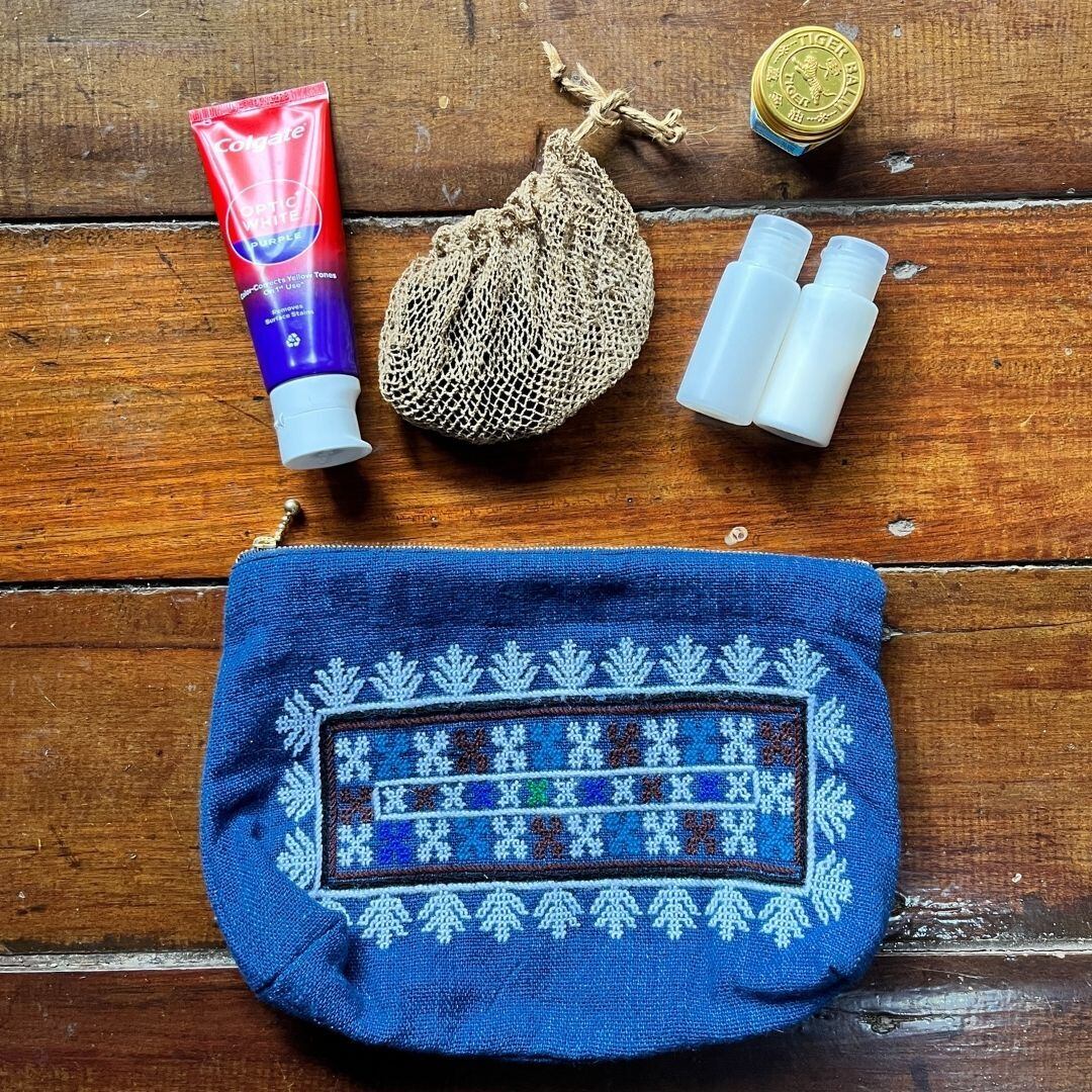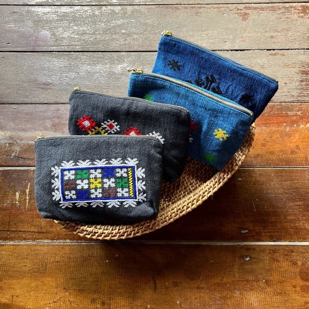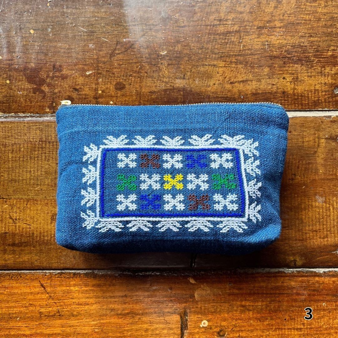 ポーチの生地はタイルー族による手紡ぎ、手織り、藍染めのコットン布を使用しております。