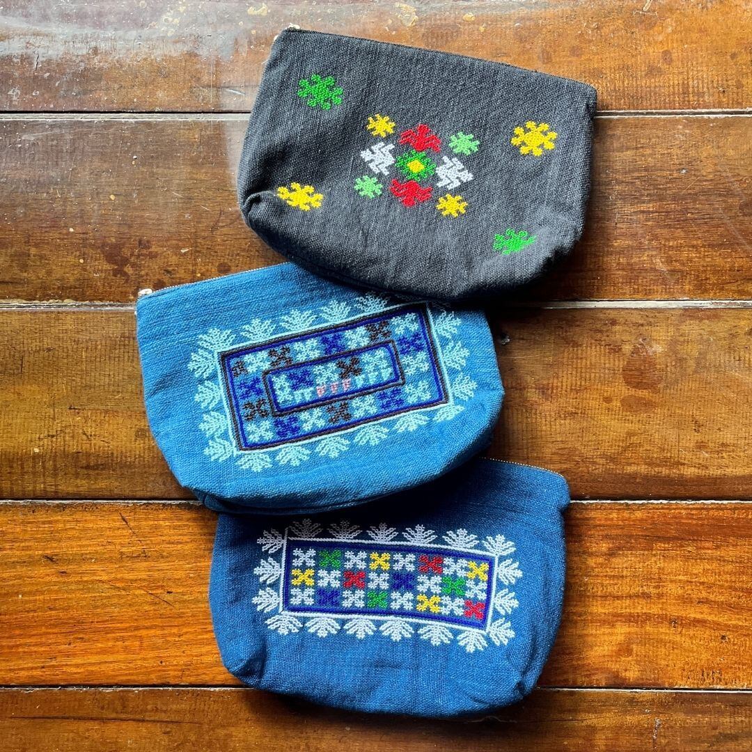 ポーチの生地はタイルー族による手紡ぎ、手織り、藍染めのコットン布を使用しております。