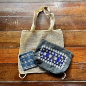 ポーチの生地はタイルー族による手紡ぎ、手織り、藍染めのコットン布を使用しております。