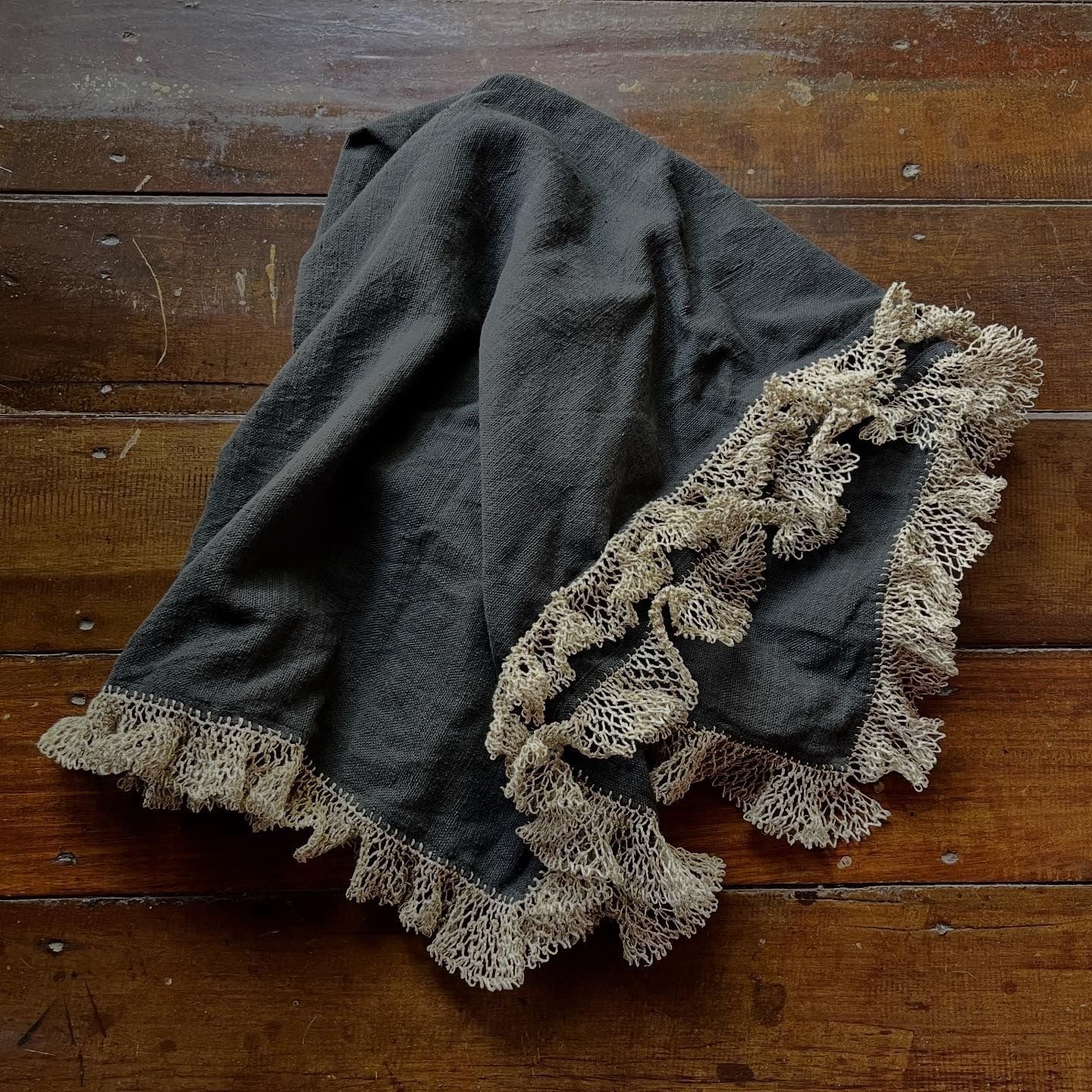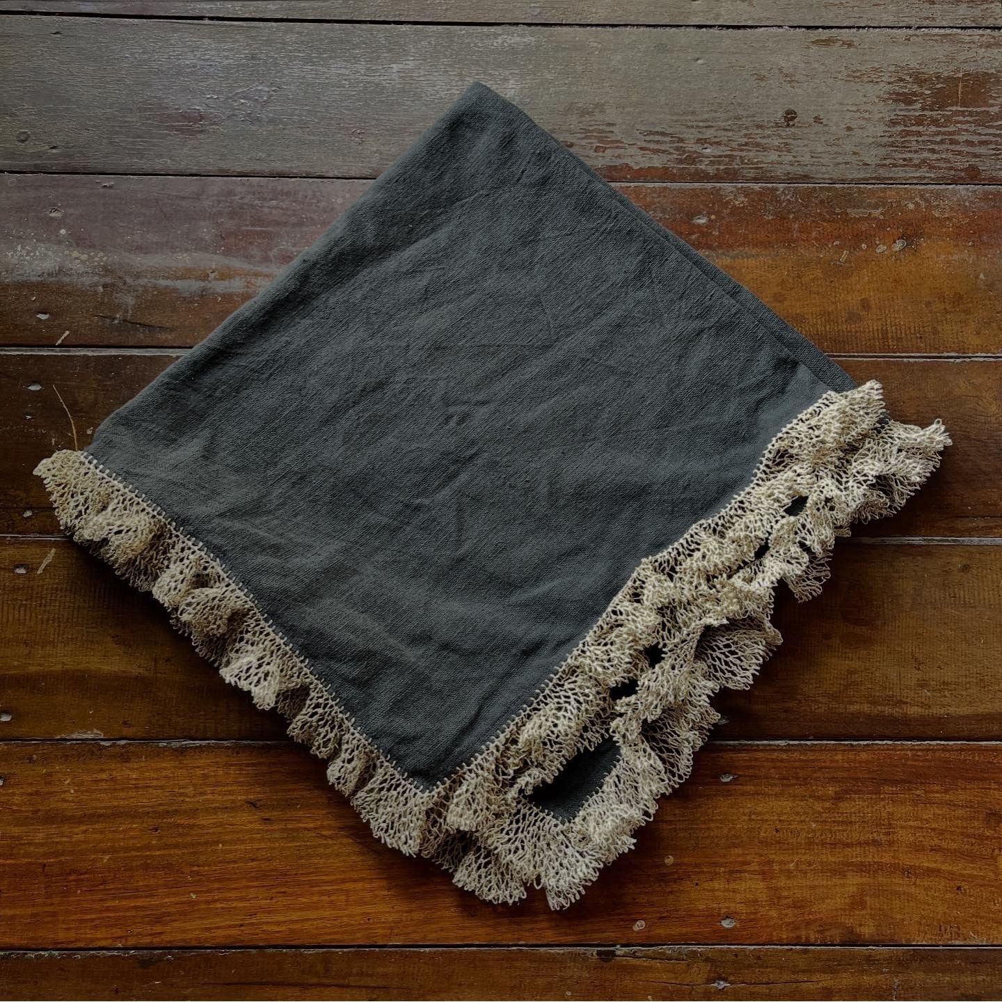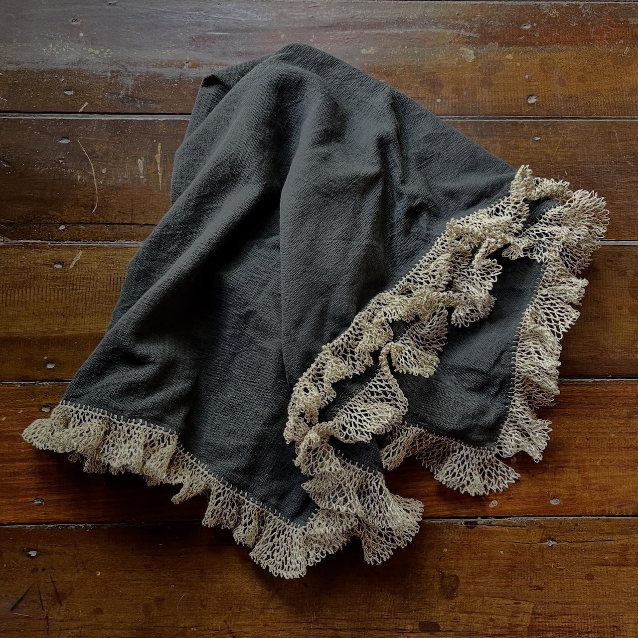 四角いスカーフに葛糸でフリルを編み込みました。